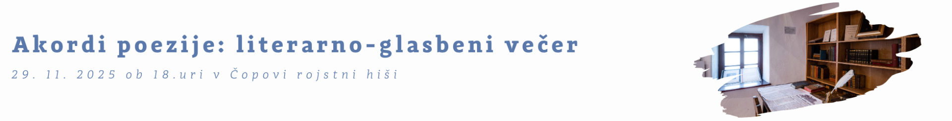 V soboto, 29. novembra 2025 ob 18.00 v Čopovi rojstni hiši v Žirovnici Kulturno društvo dr. France Prešeren Žirovnica-Breznica v sodelovanju z Javnim skladom RS za kulturne dejavnosti, Območna izpostava Jesenice pripravlja literarno glasbeni večer Akordi poezije.