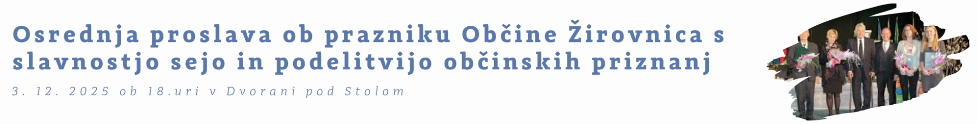 Vrhunec praznovanja bo osrednja proslava, ki se bo odvila 3. decembra v Dvorani pod Stolom v Osnovni šoli Žirovnica. Na slavnostni seji bomo podelili občinska priznanja in s tem počastili dosežke lokalne skupnosti.