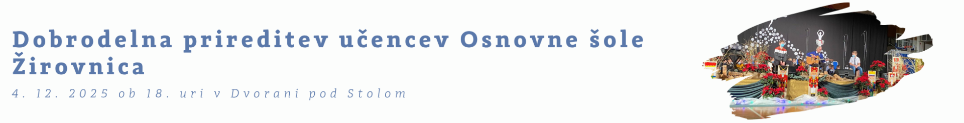 Vabljeni na dobrodelno prireditev učencev Osnovne šole Žirovnica, ki bo potekala v dvorani pod Stolom. Učenci bodo nastopali s pestrim programom, polnim glasbe, plesa in drugih točk, s katerimi bodo podprli dobrodelne namene. Pridružite se nam in podprite mlade talente ter plemeniti cilj!
